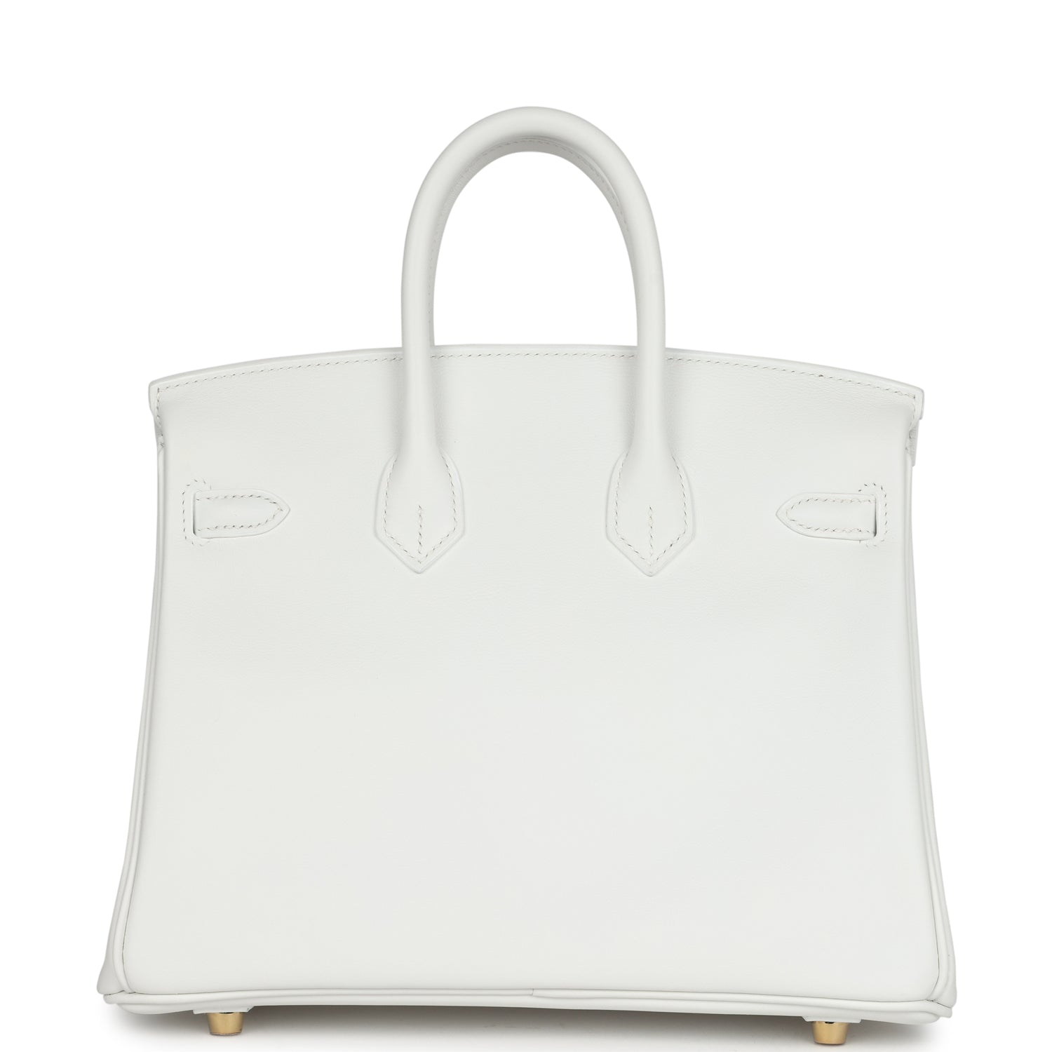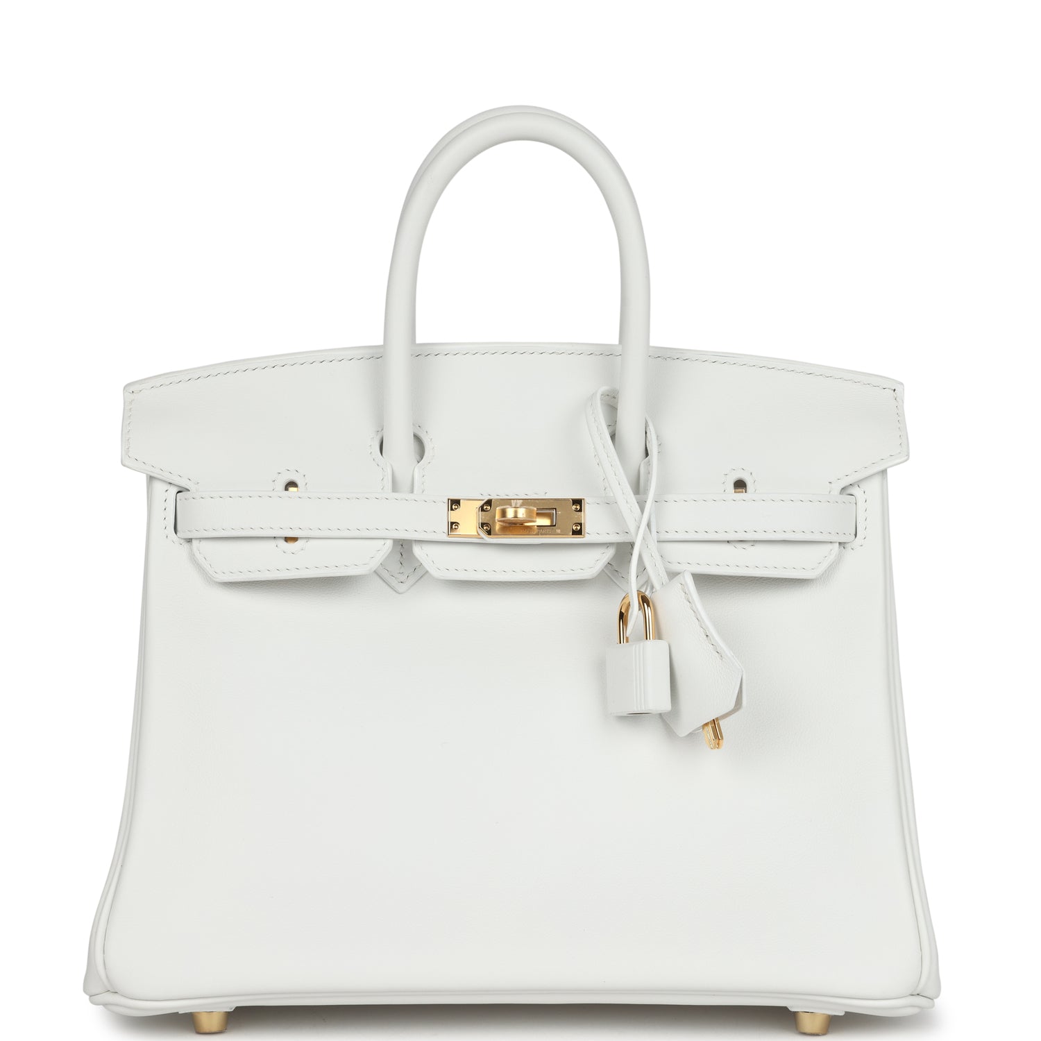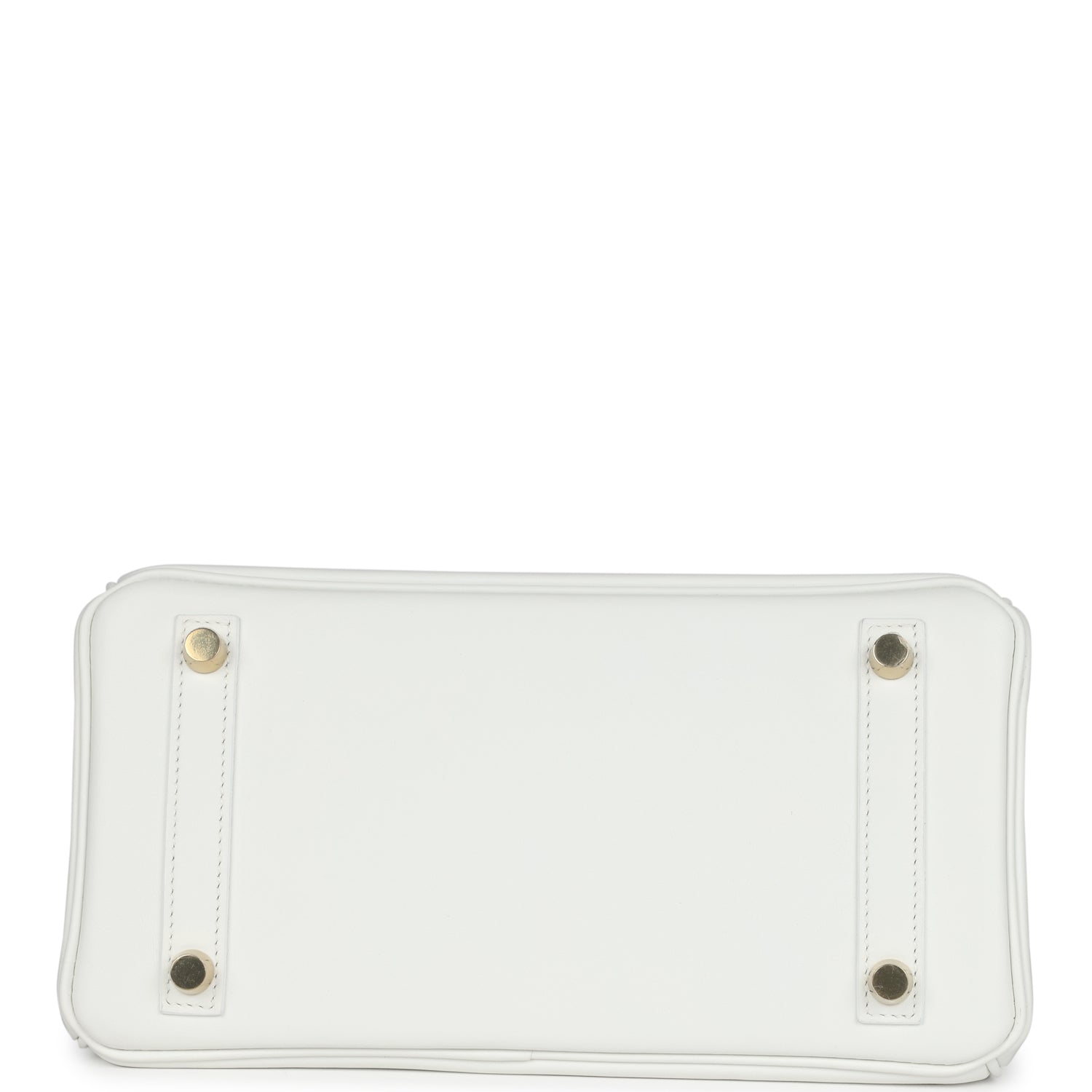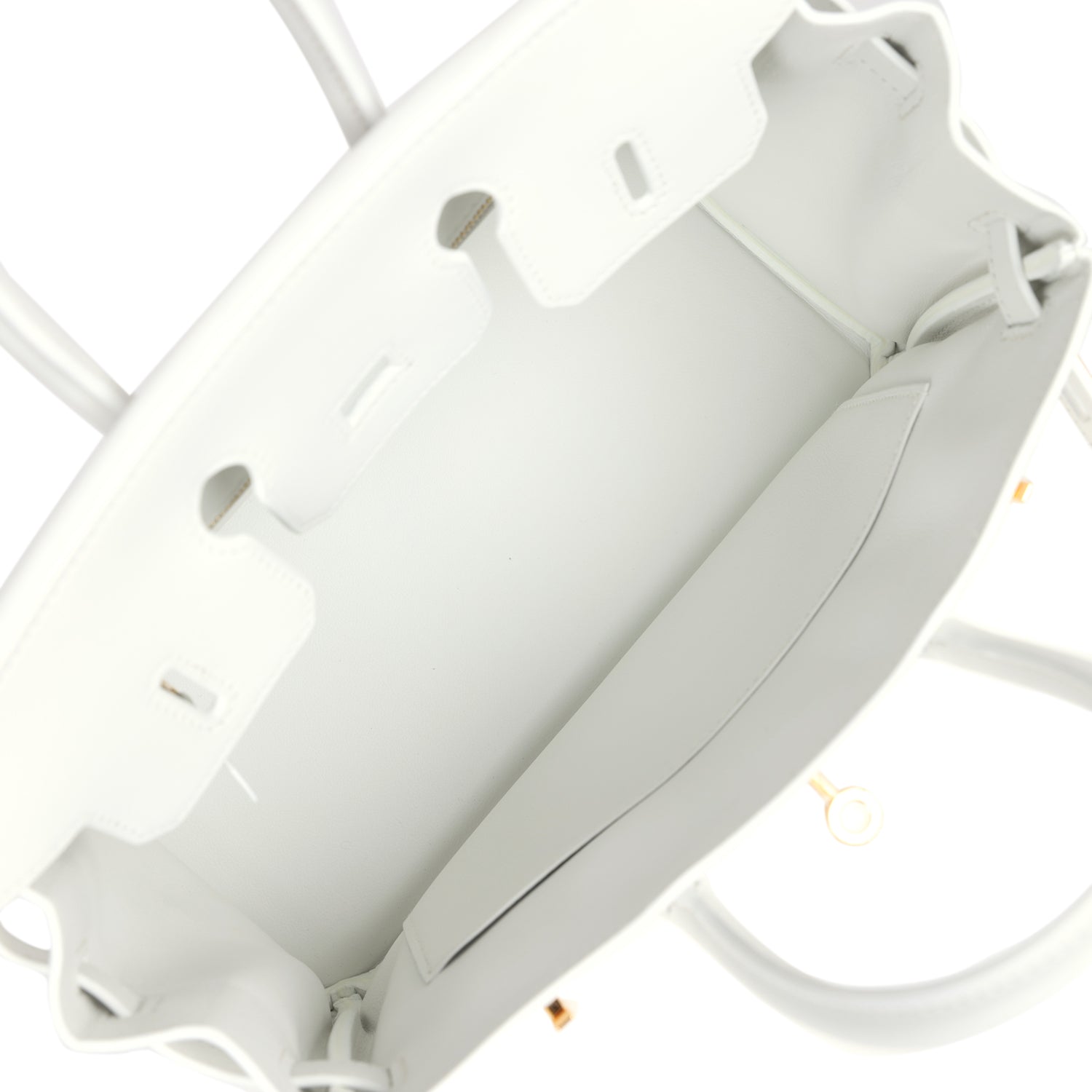 This Birkin is of New White Swift leather with gold hardware and features tonal stitching, front flap, two straps with center toggle closure, clochette with lock and two keys, and double rolled handles.