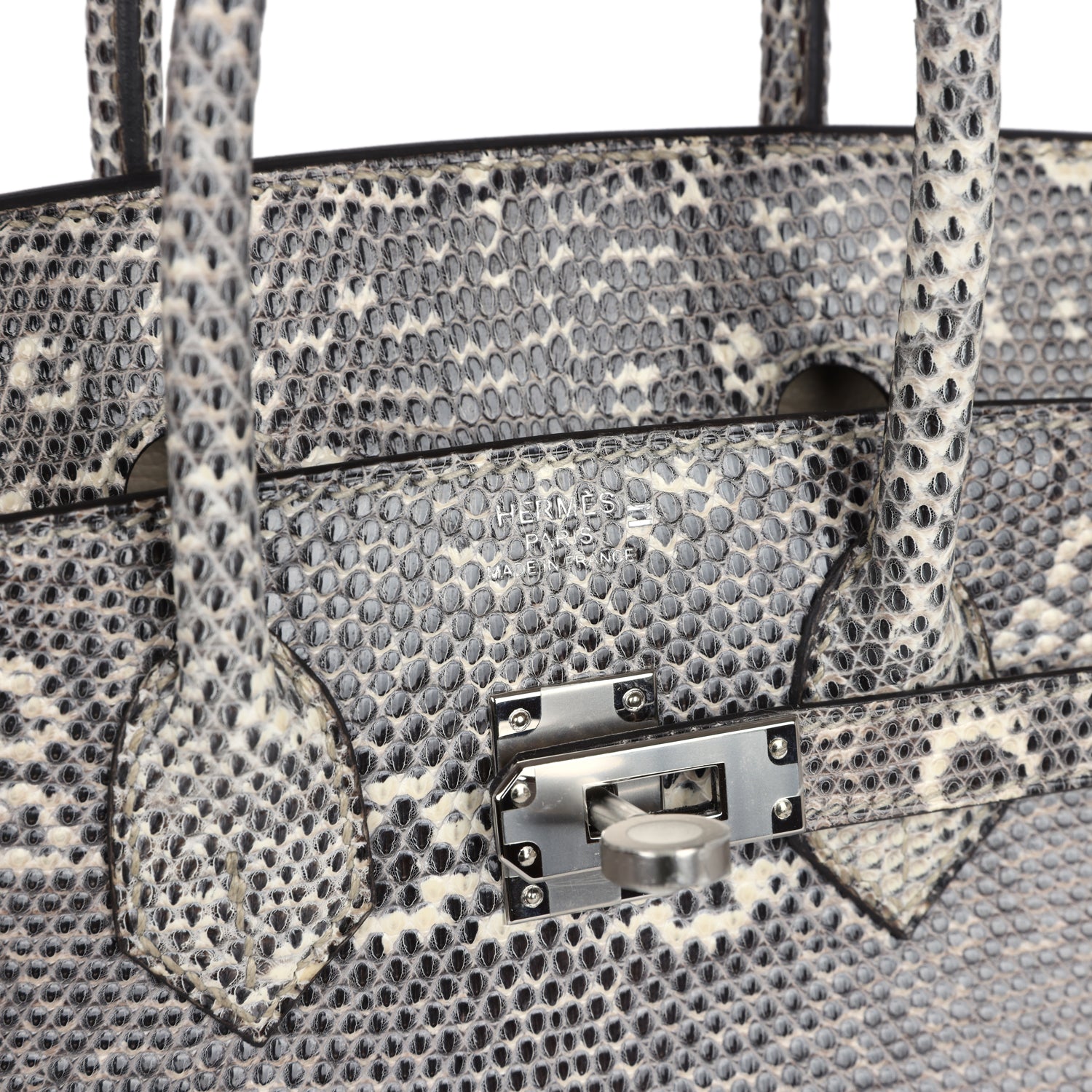 This Birkin is in Ombre Varanus Salvator Lizard with palladium hardware and has tonal stitching, front strap, two straps with center toggle closure, clochette with lock and two keys and double rolled handles.