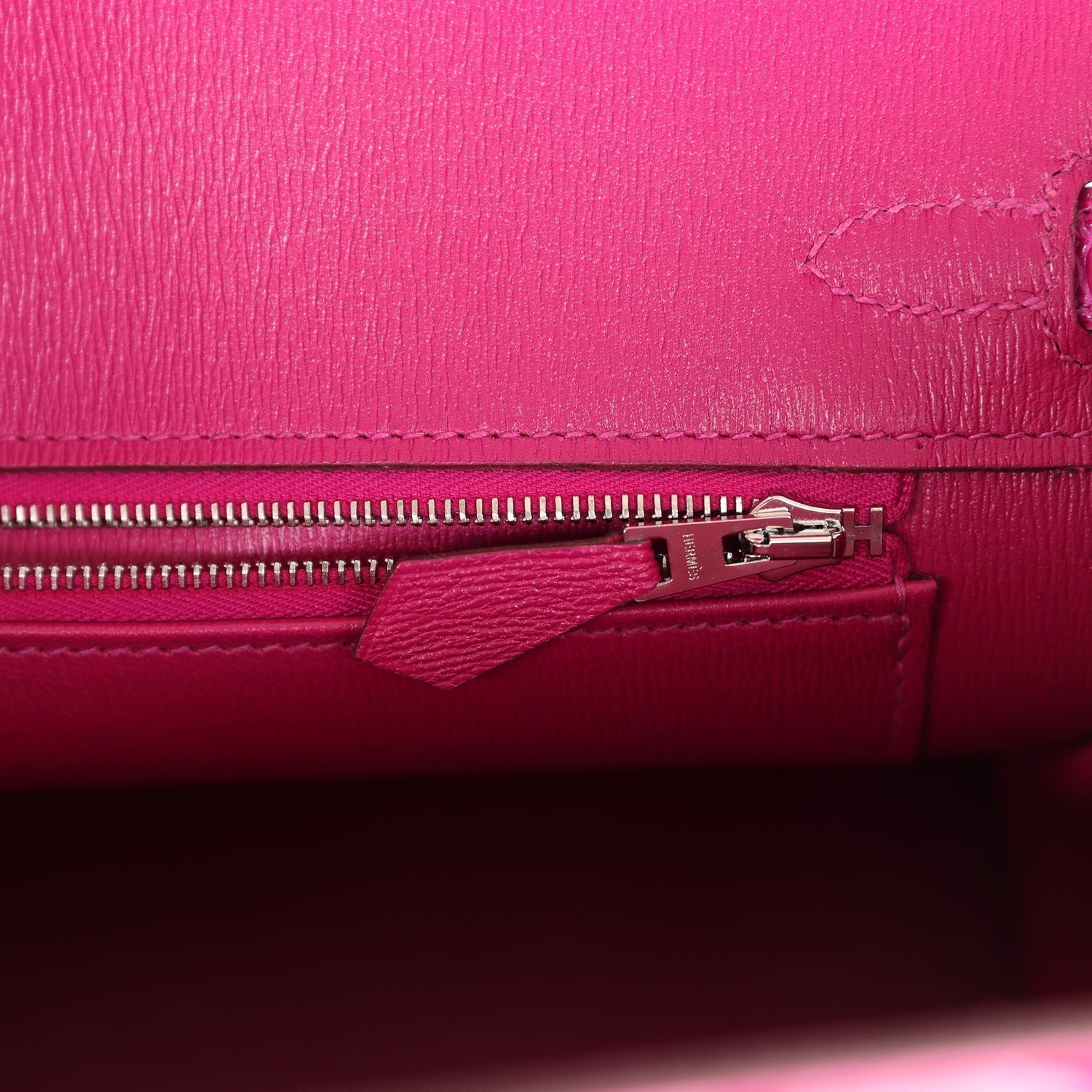The interior is lined with Rose Sheherazade chevre and has one zip pocket with an Hermes engraved zipper pull and an open pocket on the opposite side.