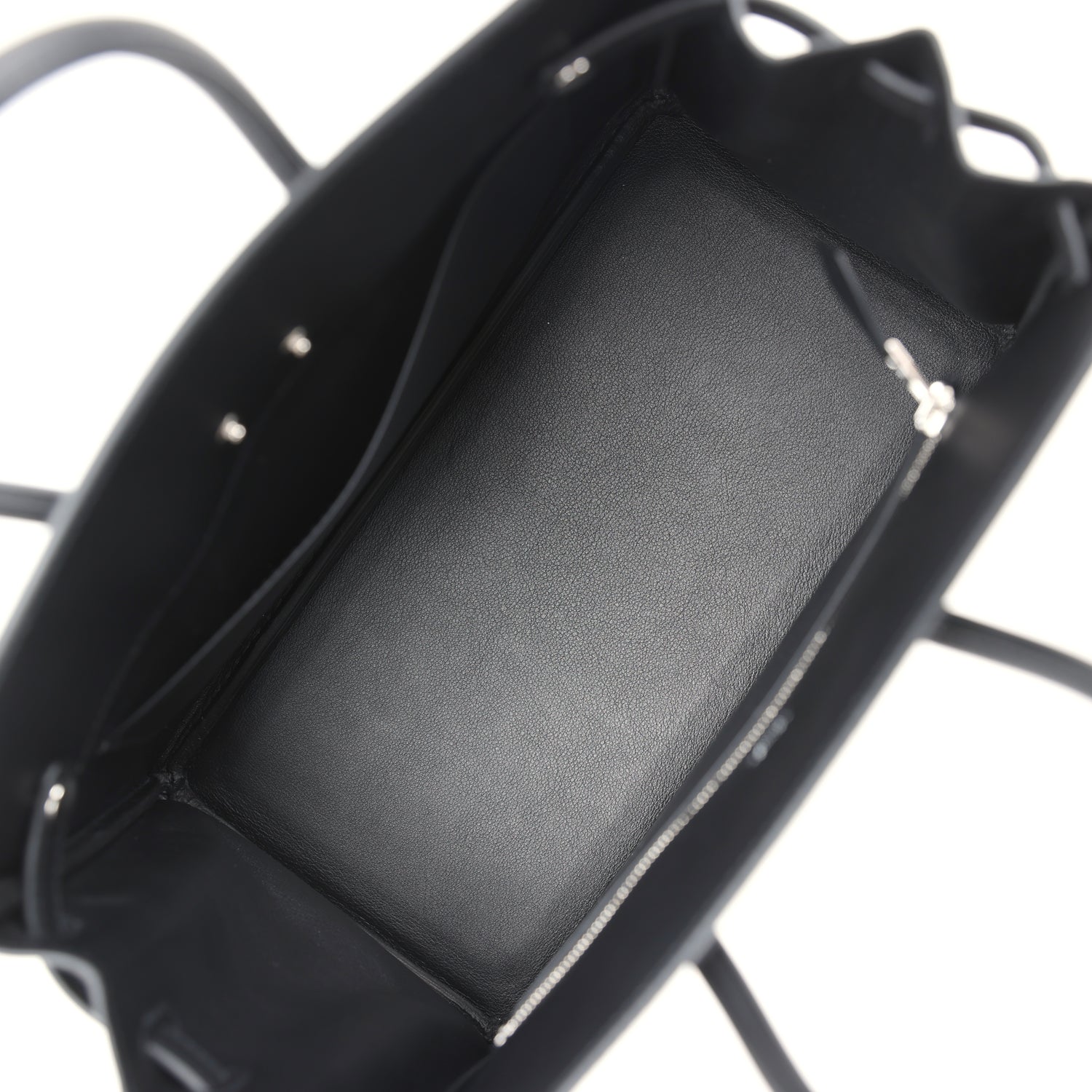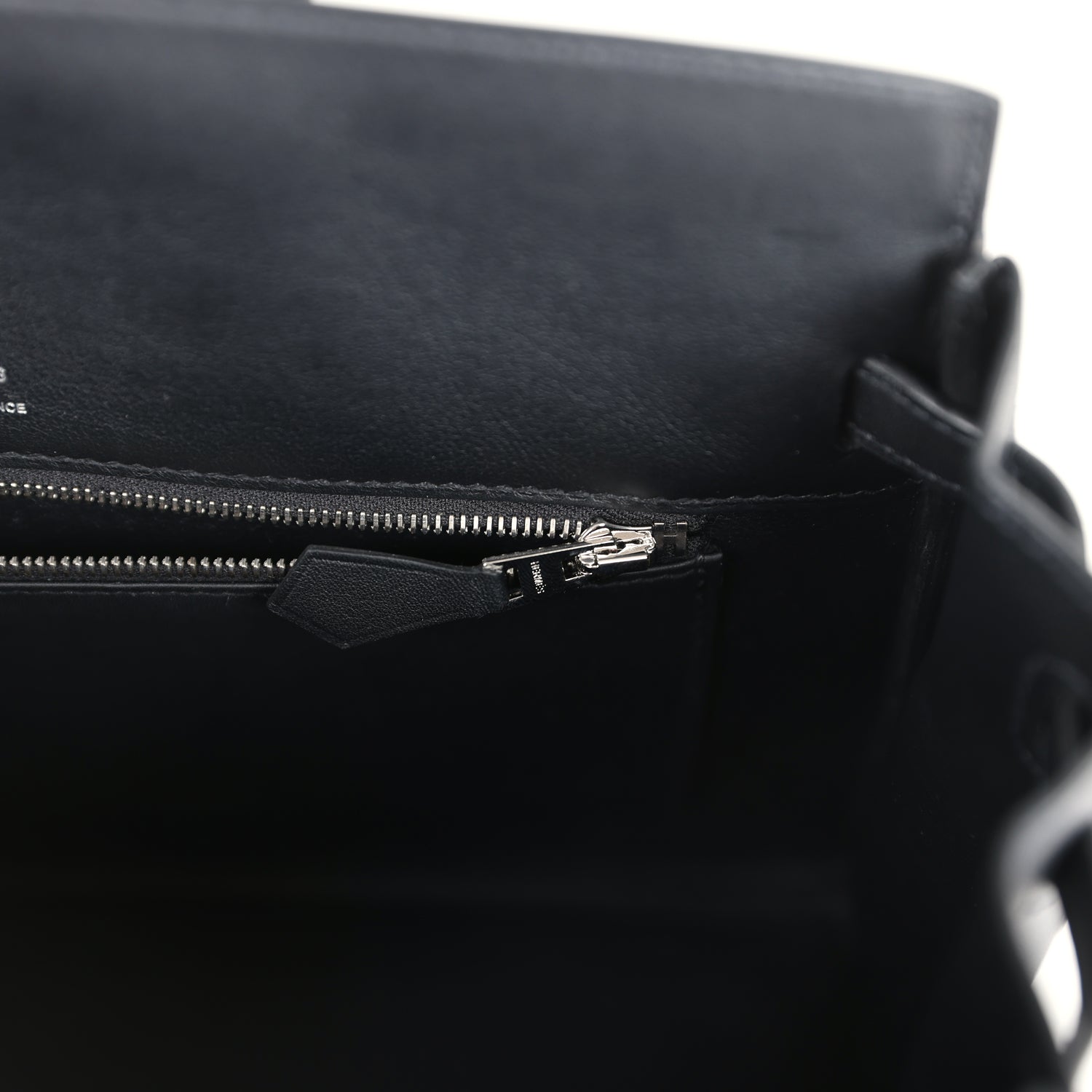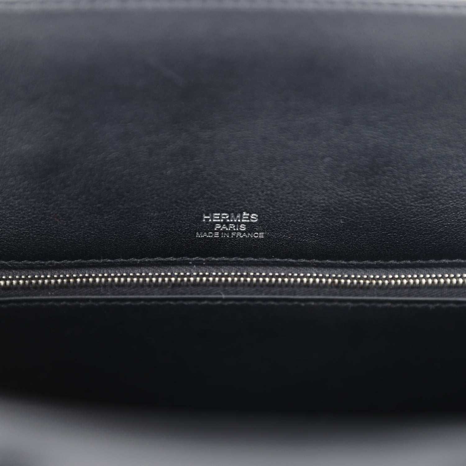 The interior is lined with Black chevre and is one zip pocket with an Hermes engraved pull and an open pocket on opposite side.