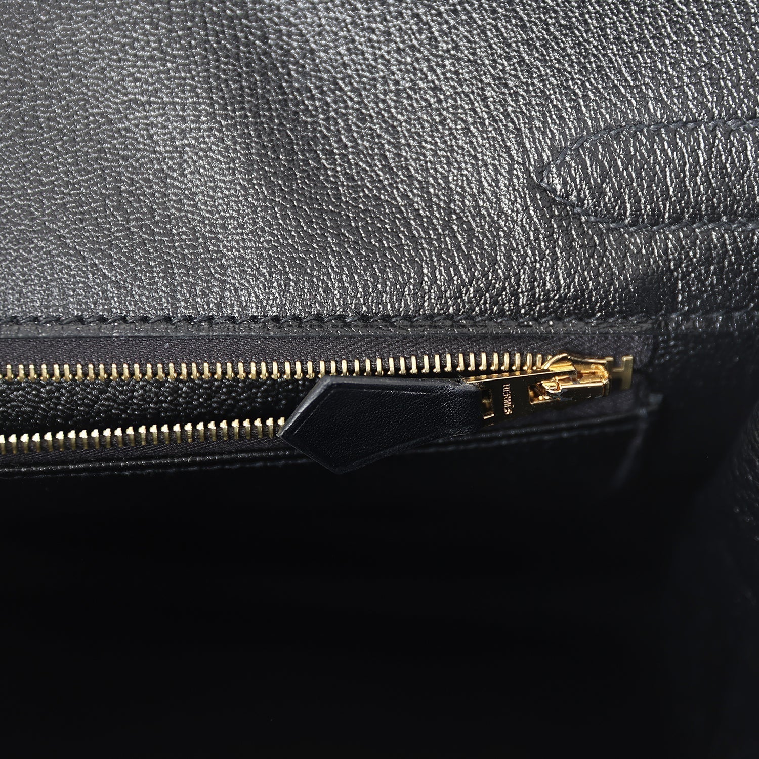 The interior is lined with Black chevre and has one zip pocket with an Hermes engraved zipper pull and an open pocket on the opposite side.