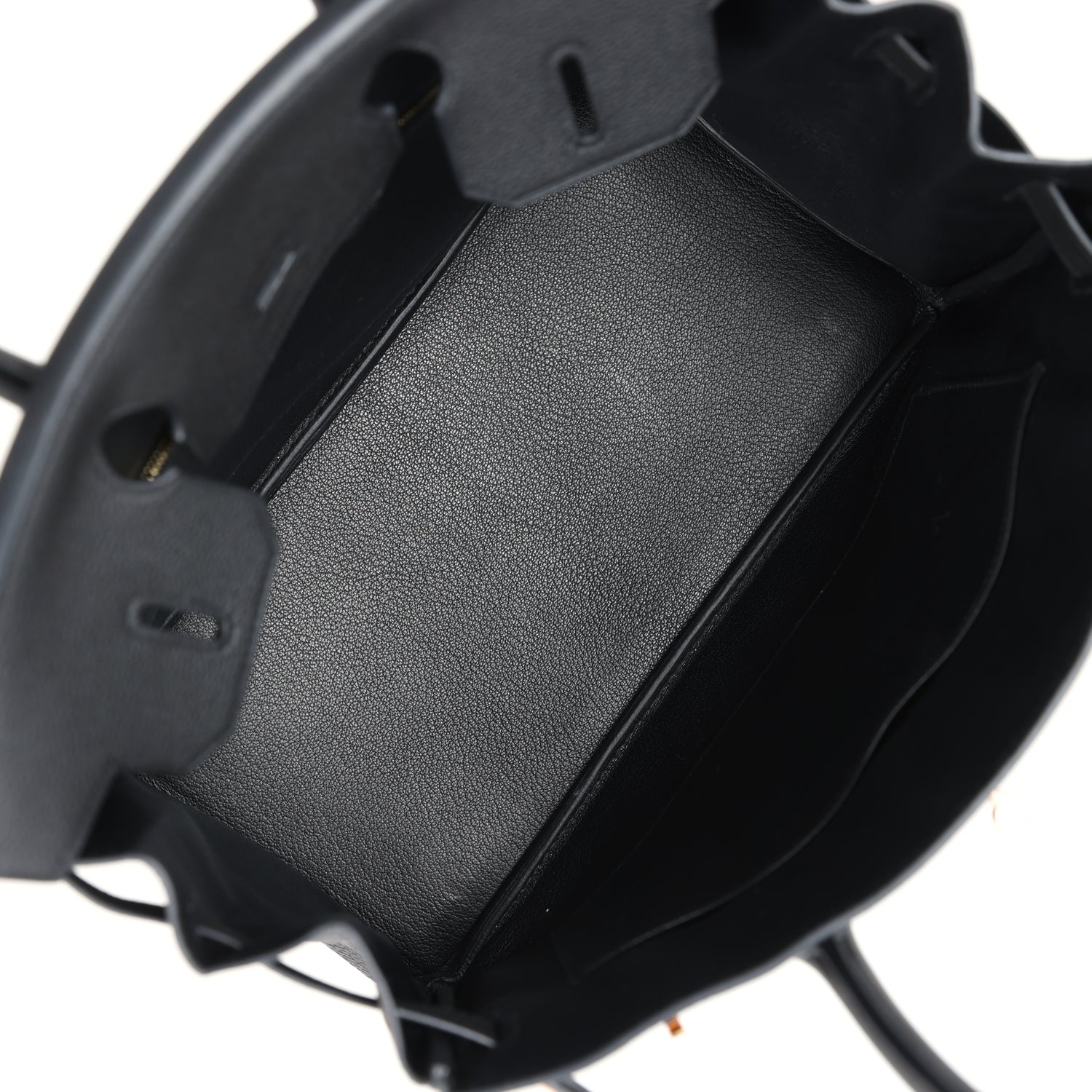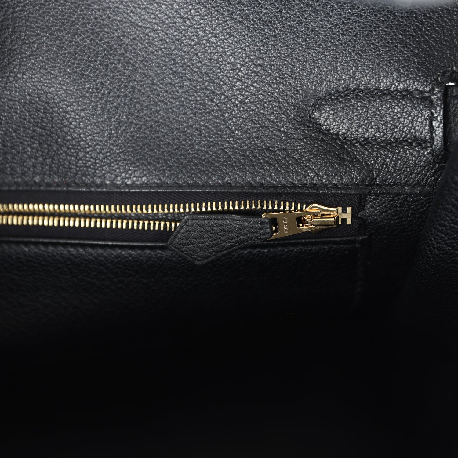 The interior is lined with Black chevre and has one zip pocket with an Hermes engraved zipper pull and an open pocket on the opposite side.