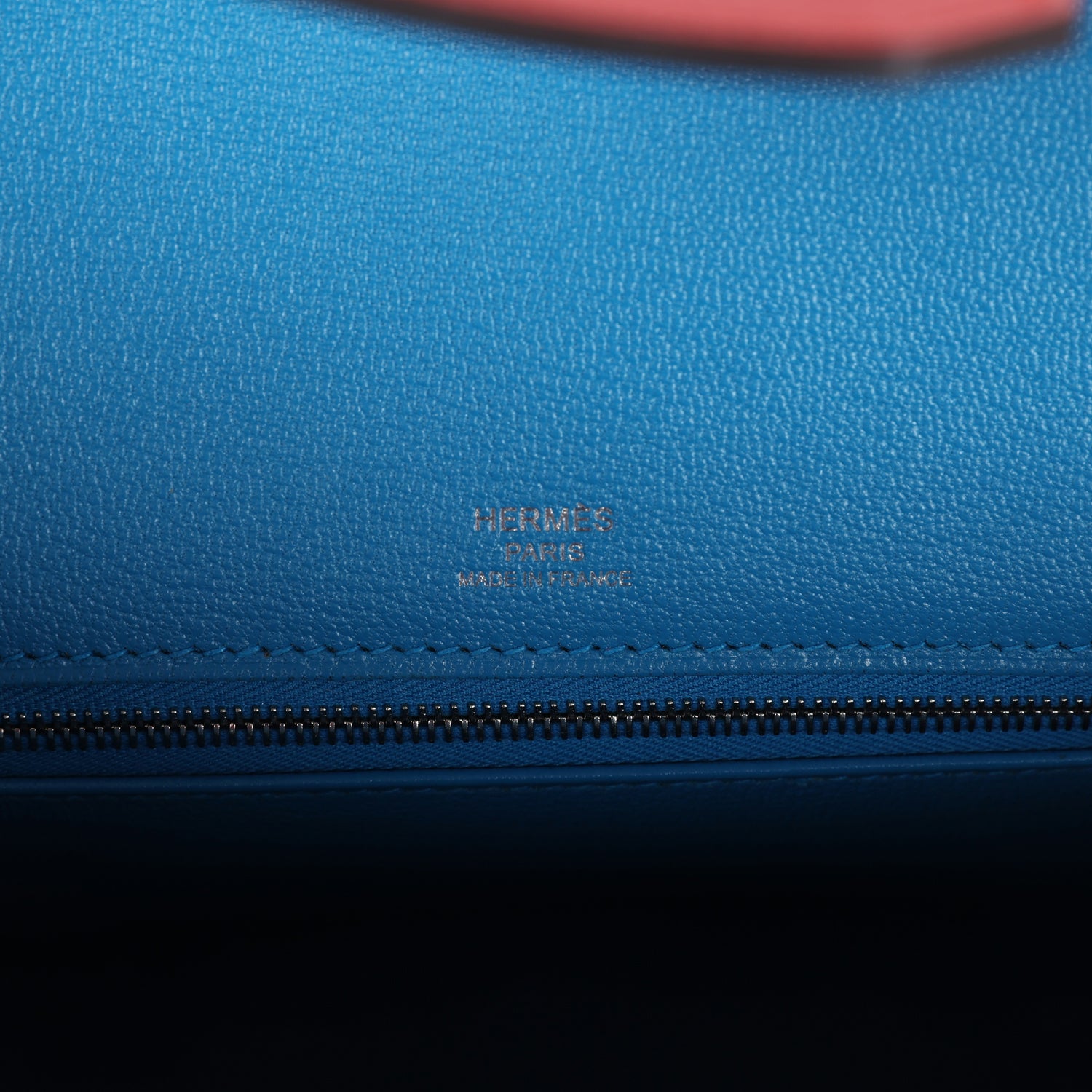 The interior is lined with Bleu Zanzibar chevre and has one zip pocket with an Hermes engraved zipper pull and an open pocket on the opposite side.