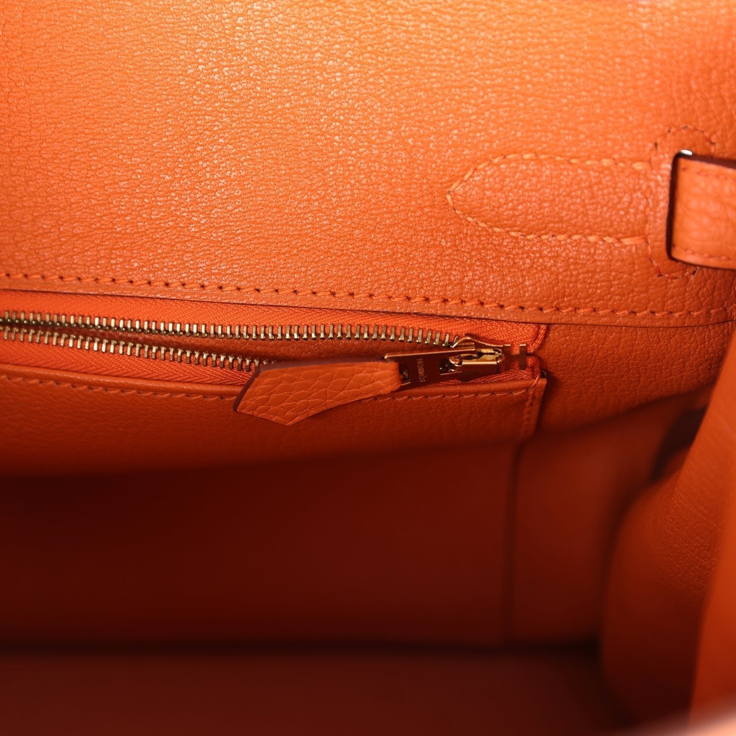 The interior is lined with Orange chevre and has one zip pocket with an Hermes engraved zipper pull and an open pocket on the opposite side.