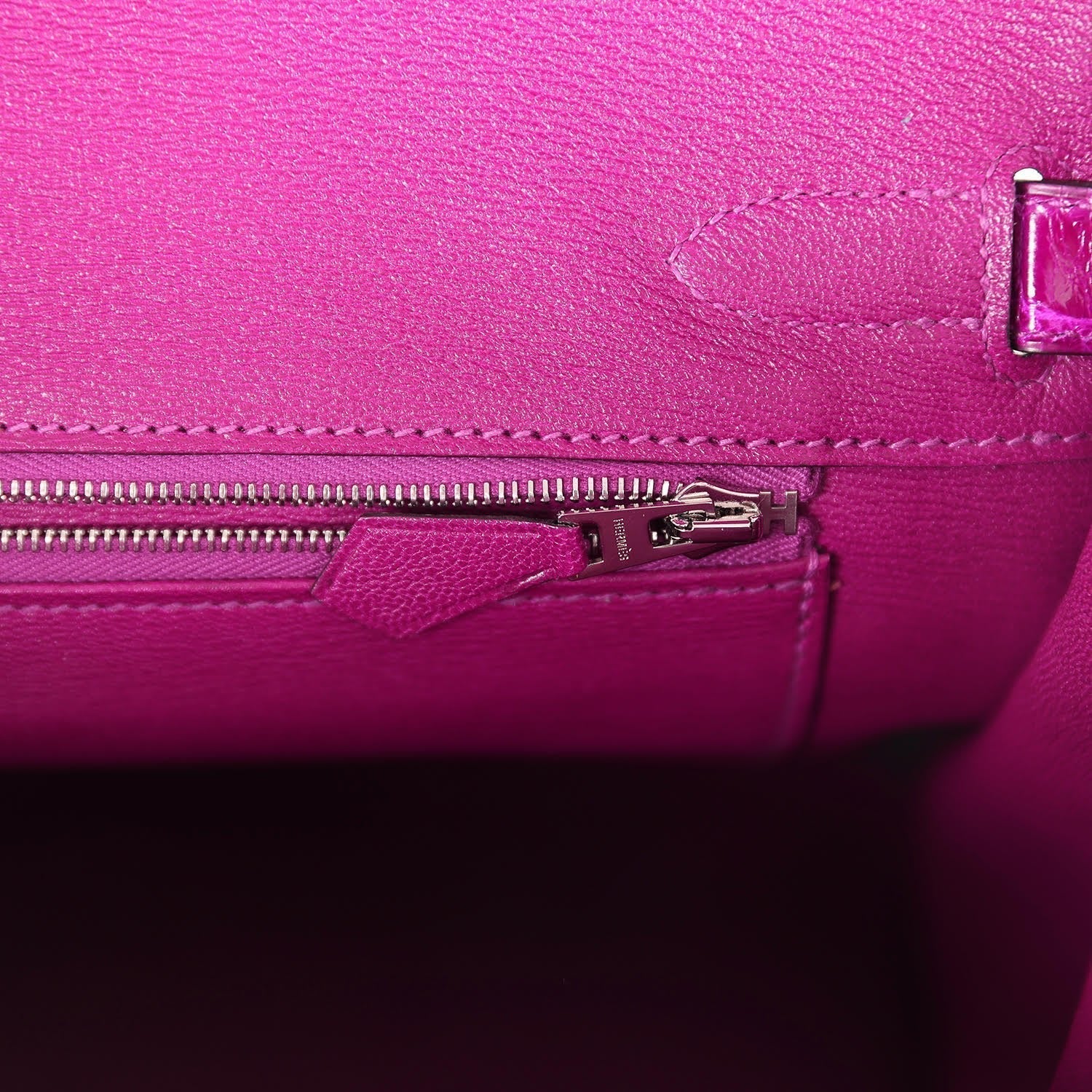 The interior is lined in Rose Pourpre chevre leather and has a zip pocket with Hermes engraved pull; pocket on opposite side.