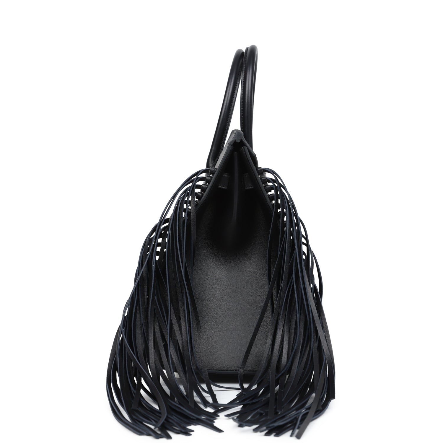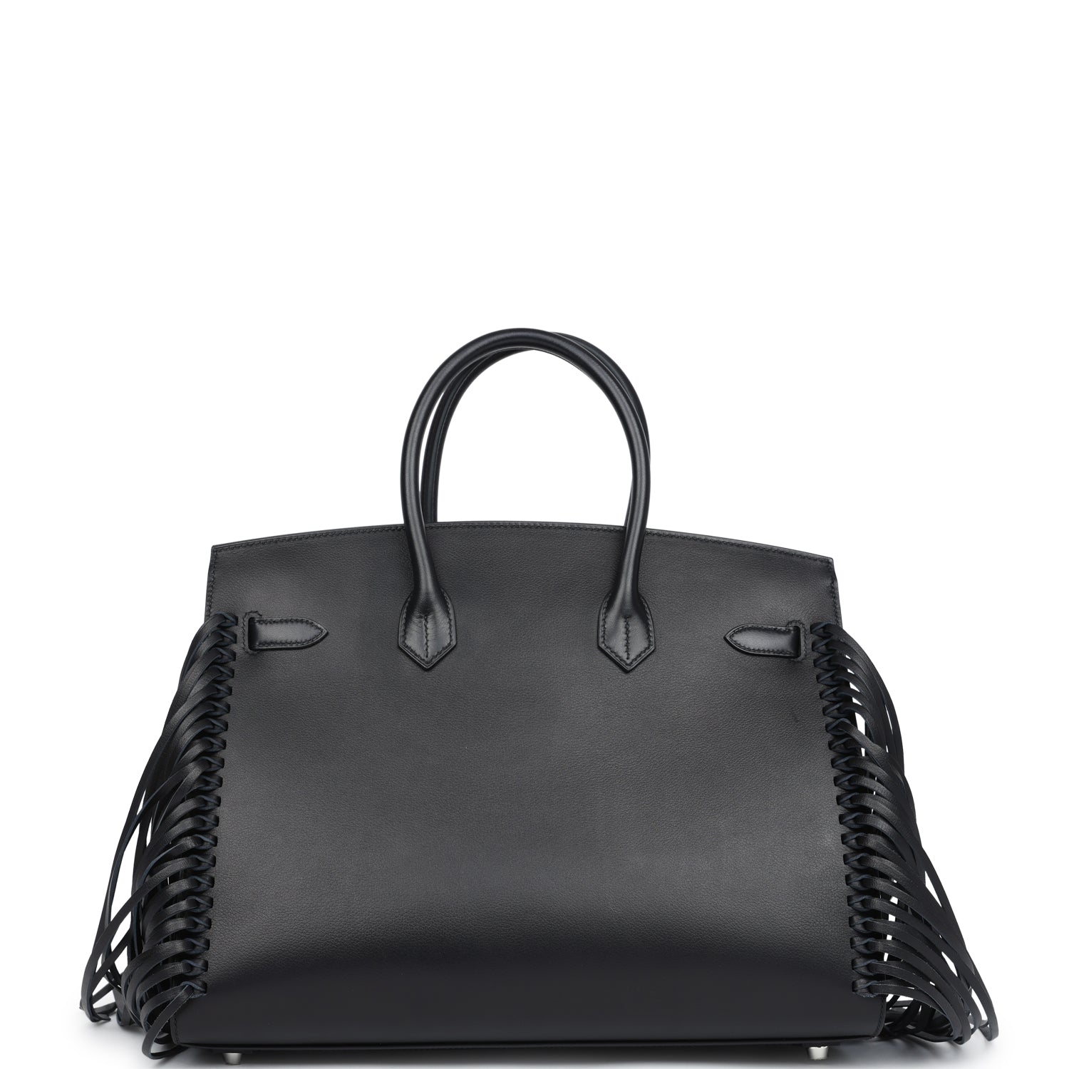 This Anate Birkin is in Black evergrain leather with palladium hardware and has tonal stitching, fringe side detailing on front and back, front flap, two straps with center toggle closure, clochette with lock and two keys, and double rolled handles.