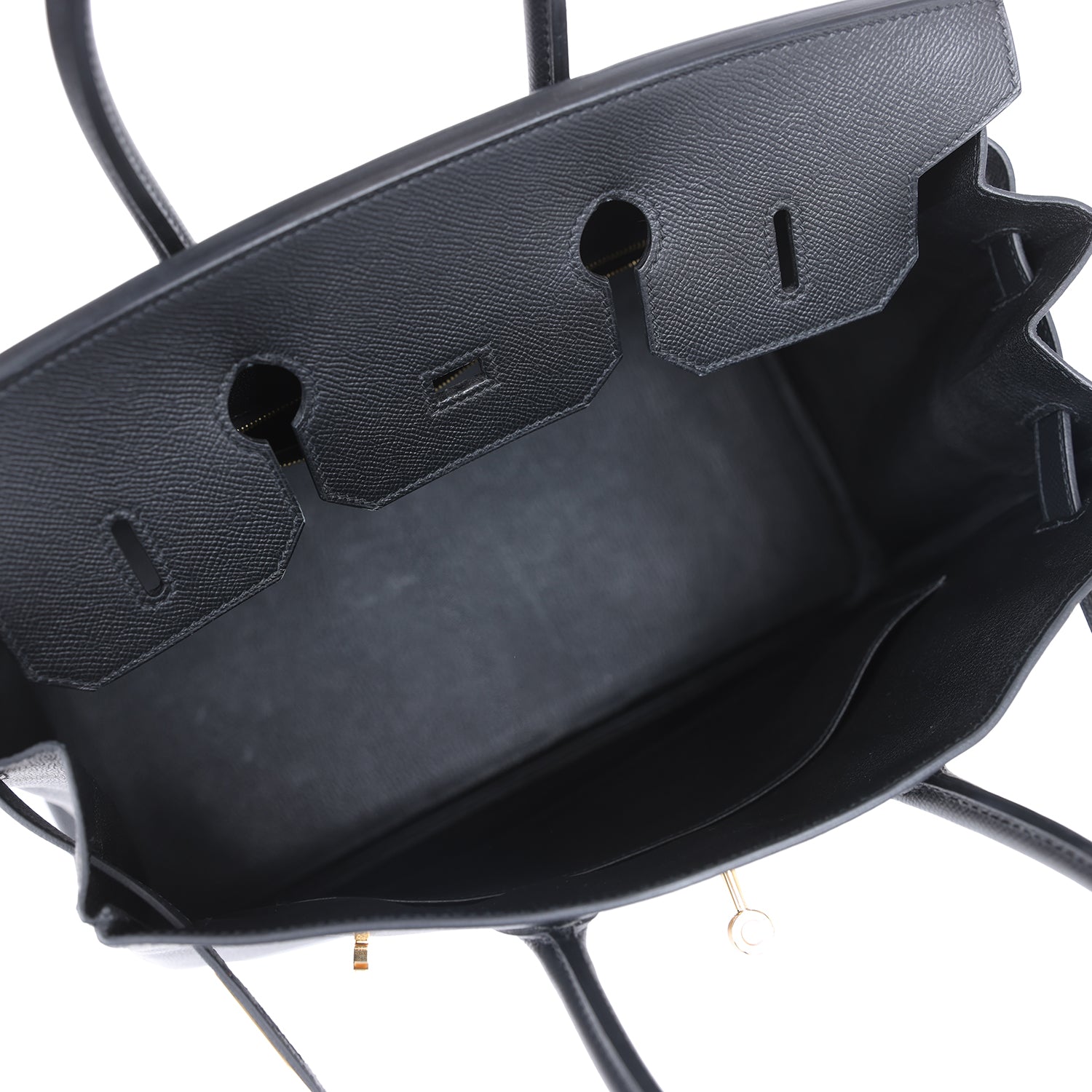 The interior is lined with black chevre and has one zip pocket with an Hermes engraved zipper pull and an open pocket on the opposite side.