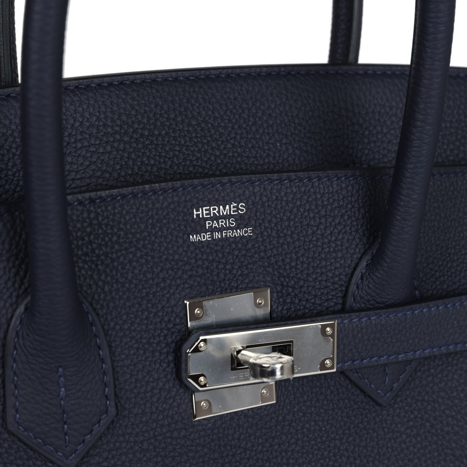 This Birkin is in Bleu Nuit togo leather with palladium hardware and has tonal stitching, front flap, two straps with center toggle closure, clochette with lock and two keys, and double rolled handles.