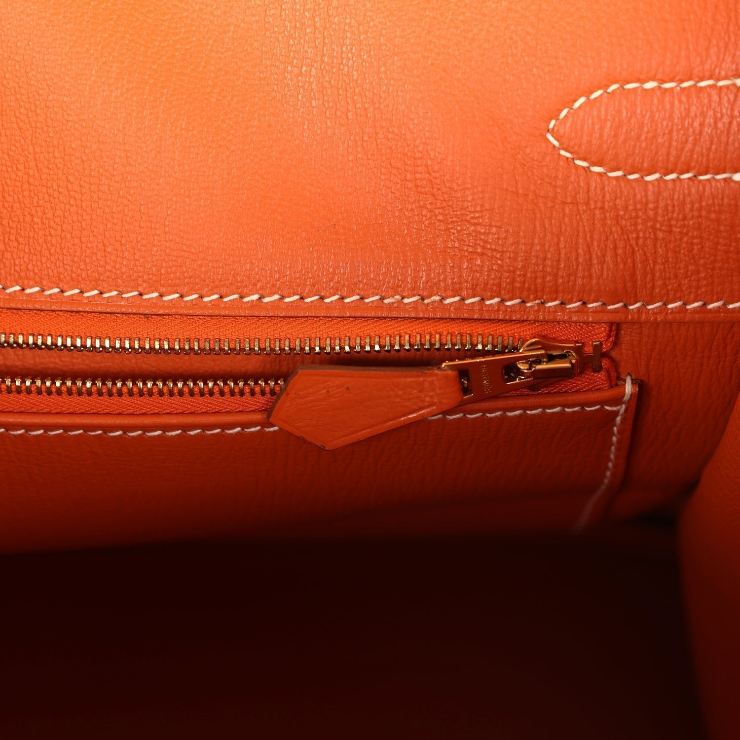 The interior is lined with Potiron chevre and has one zip pocket with an Hermes engraved zipper pull and an open pocket on the opposite side.