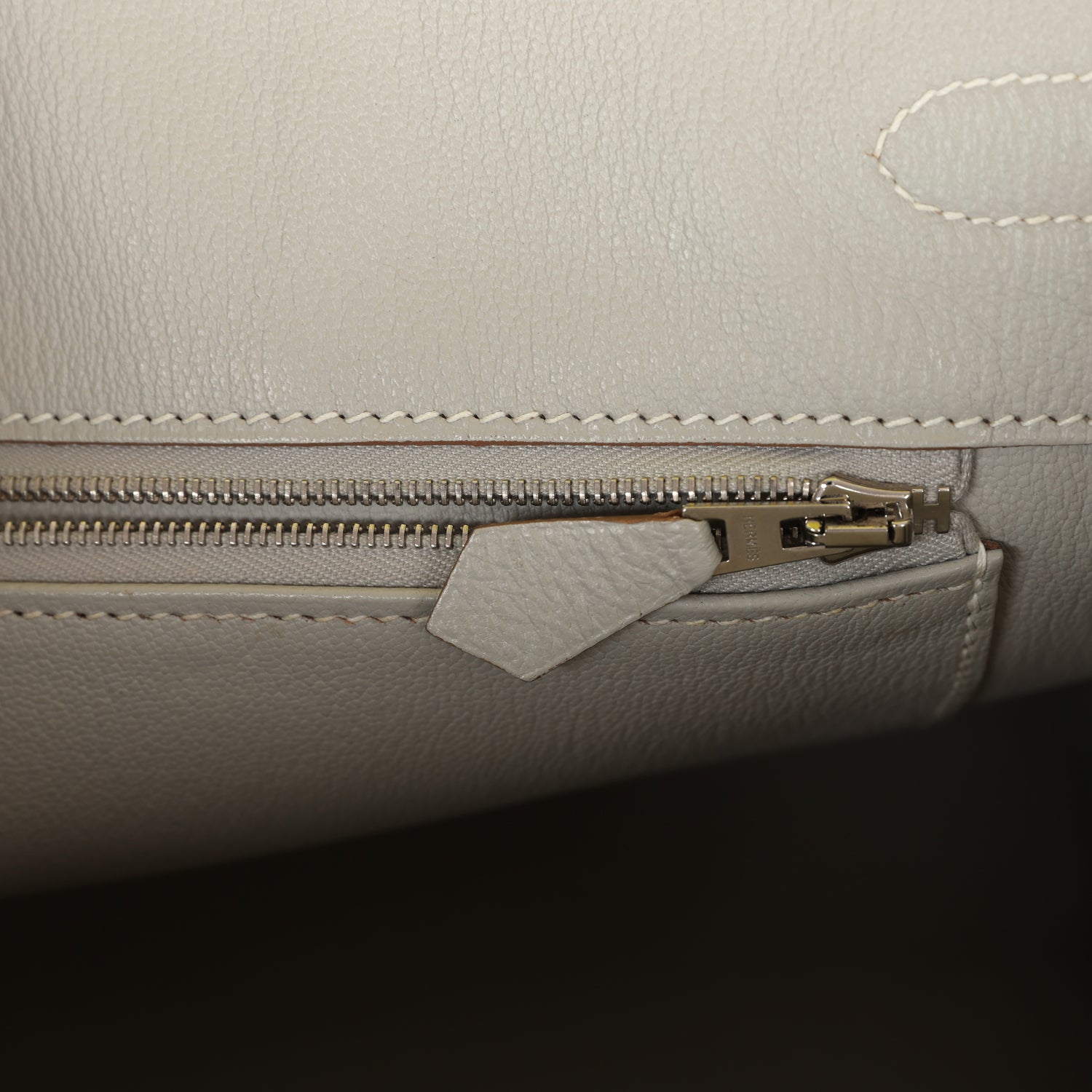 The interior is lined in Gris Perle chevre leather with one zip pocket with an Hermes engraved zipper pull and an open pocket on the opposite side.