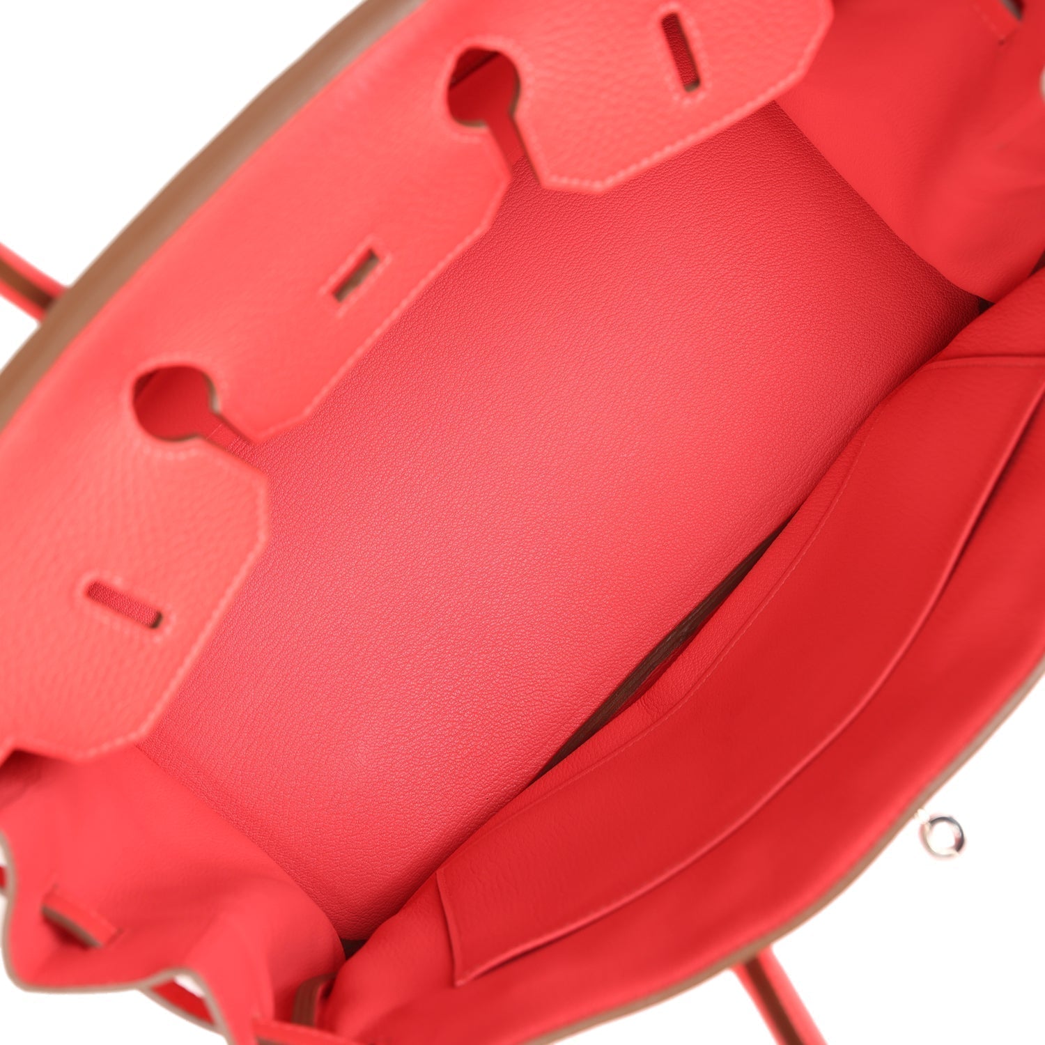 The interior is lined with Rose Jaipur chevre and has one zip pocket with an Hermes engraved zipper pull and an open pocket on the opposite side.