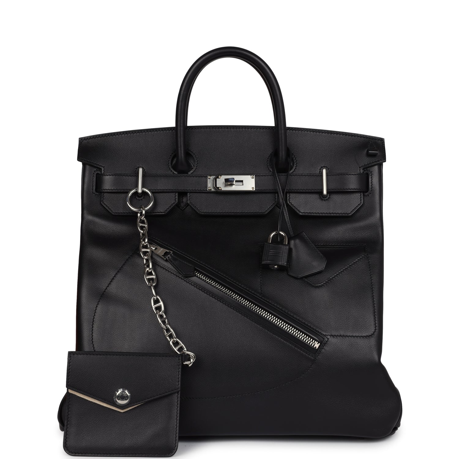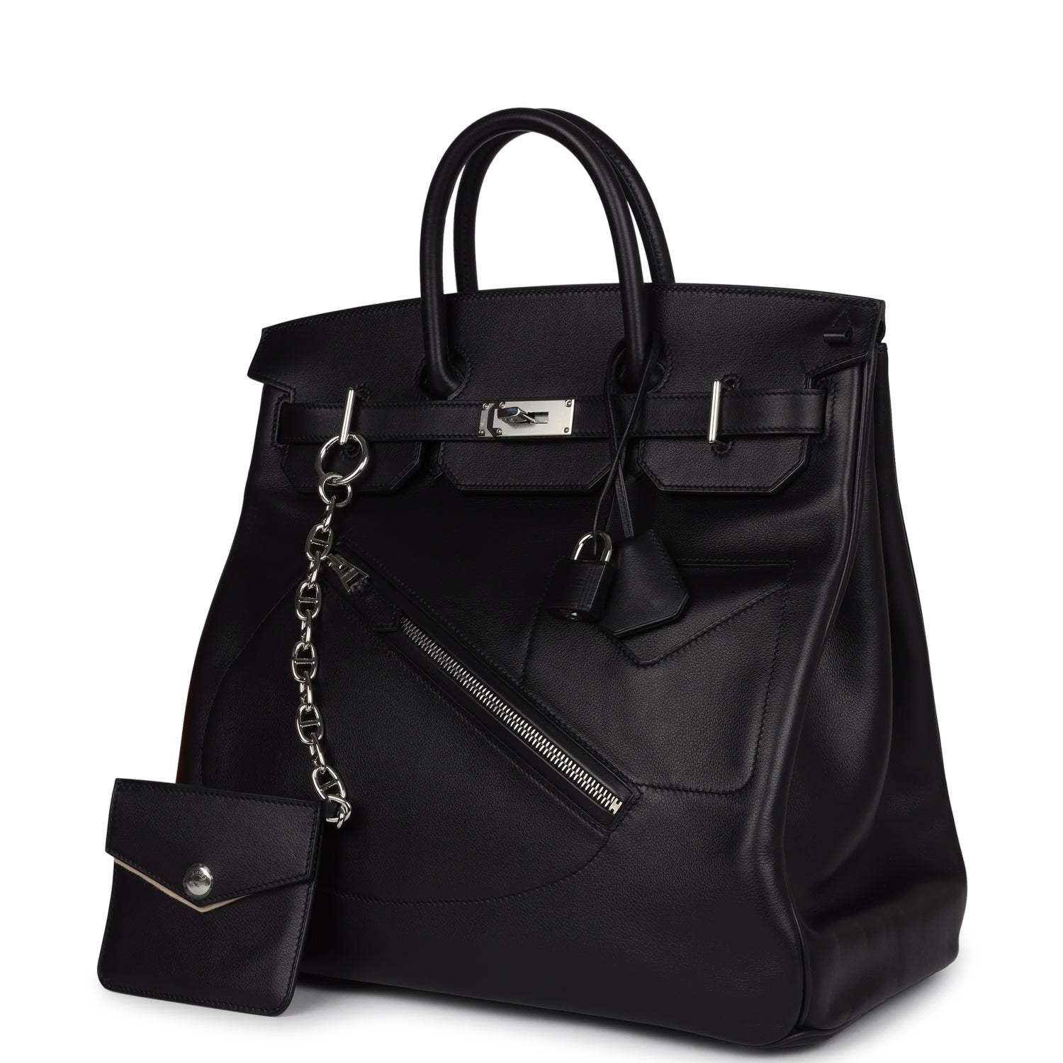 This limited edition Birkin 'Rock' HAC 40 is in Black evergrain leather with palladium hardware, features a diagonal saddle shaped zippered pocket and a detachable fastened pocket on a keychain, tonal stitching, double rolled handles, clochette, two keys, one lock, toggle front closure, no inside pockets, and one zippered pocket on back of bag.