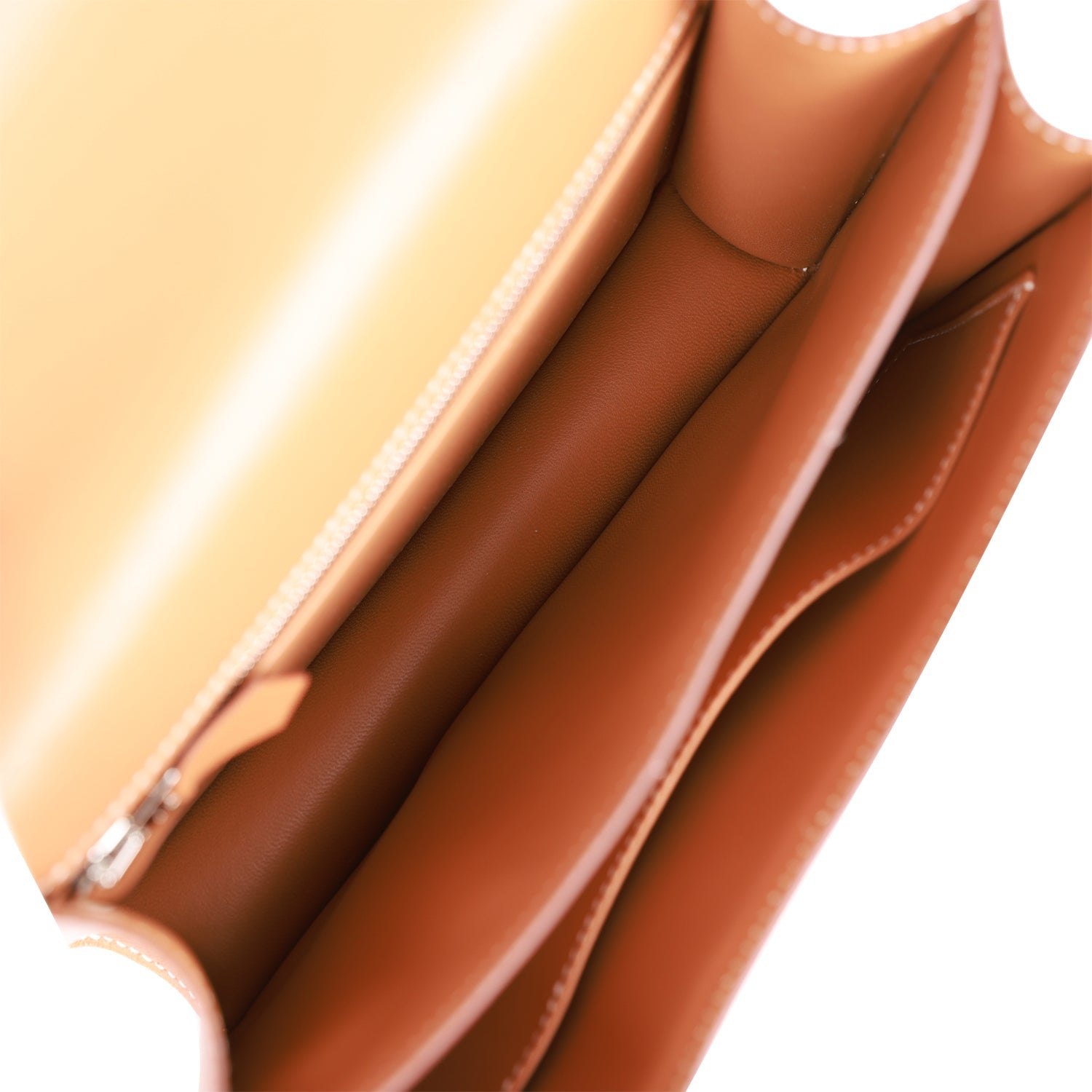 The interior is lined with gold lambskin leather and has a zip pocket with an Hermes engraved pull.