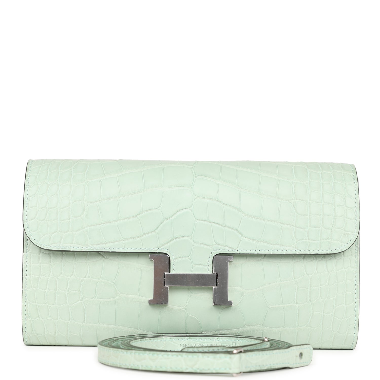 This Constance Wallet To Go is in Vert D'eau matte alligator with palladium hardware, has tonal stitching, metal 'H' snap lock closure, open front compartment, and removable crossbody strap.