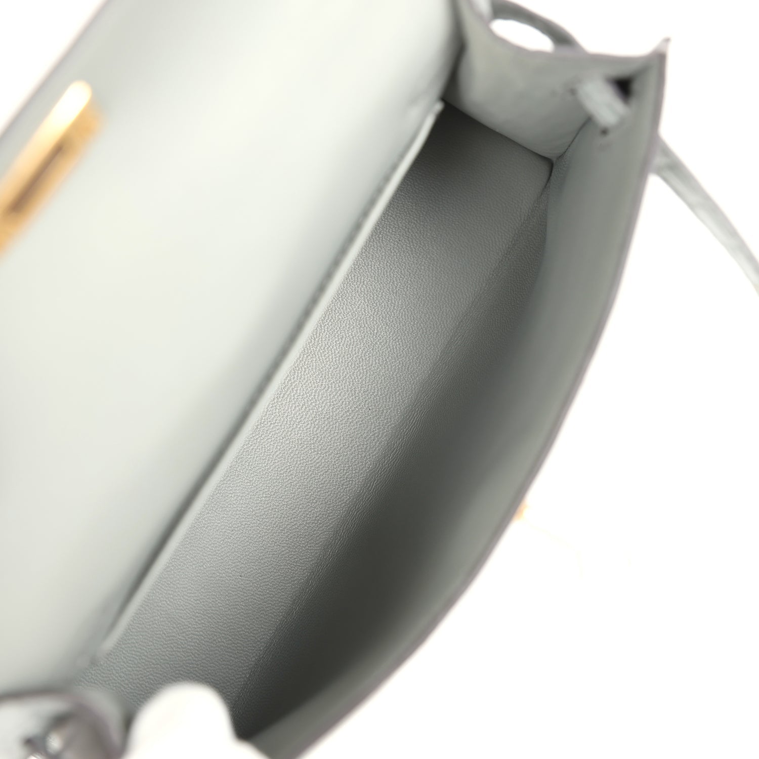 The interior is lined with Gris Ciment lambskin leather and has one open pocket on the back wall.