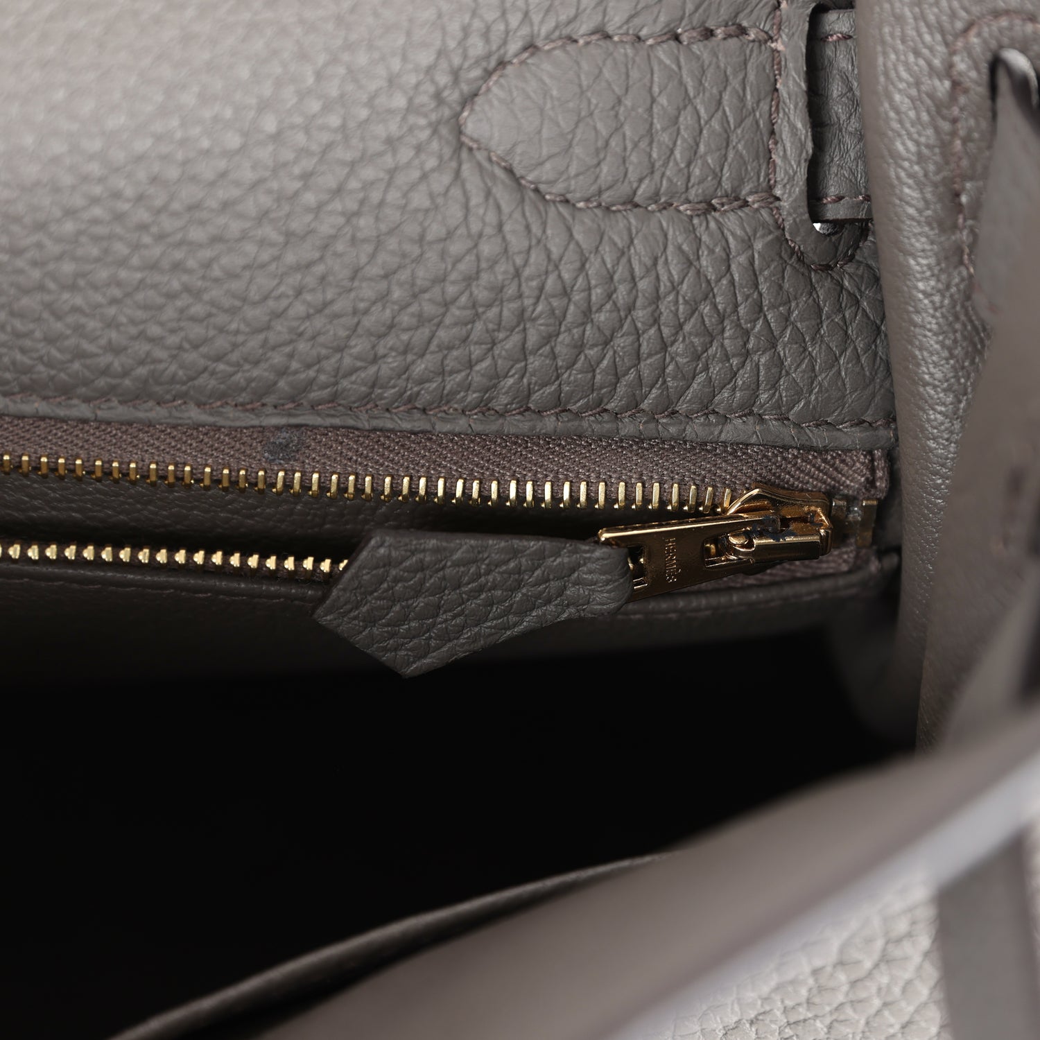 The interior is lined in Etain chevre and has one zip pocket with Hermes engraved pull and two open pockets on the opposite side.