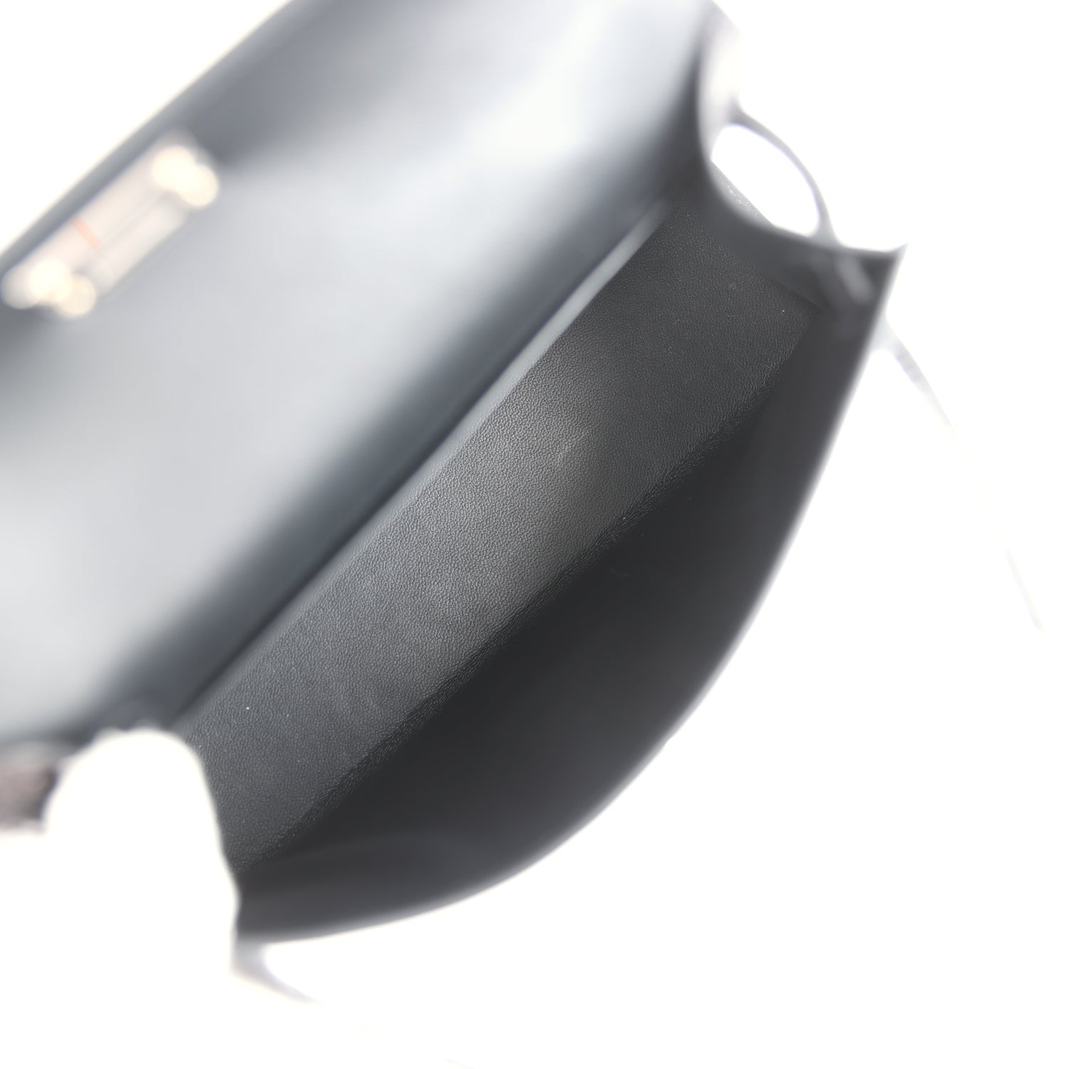 The interior is lined with Black lambskin leather and has one open pocket on the back wall.