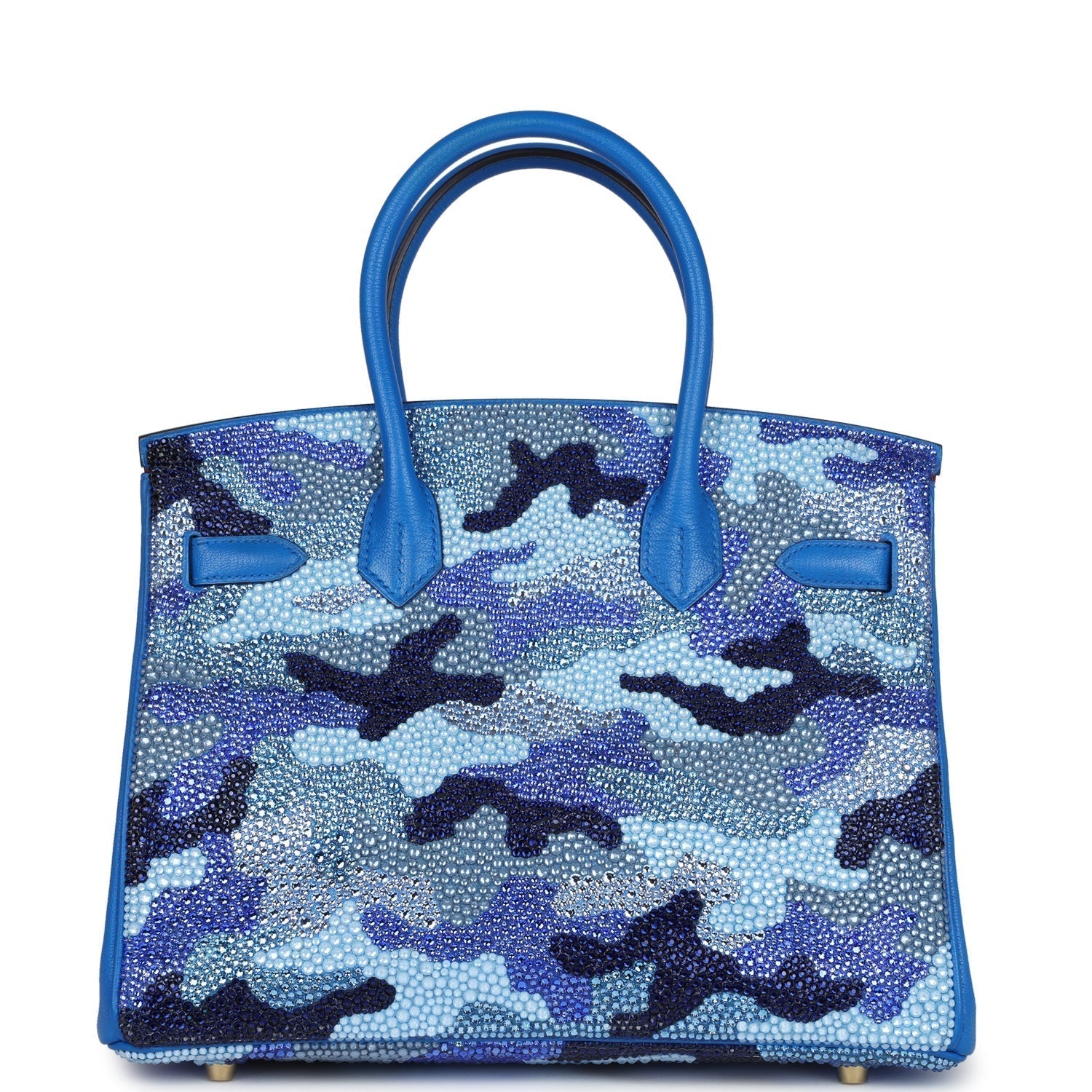 Custom Camouflage Swarovski Crystal Hermes Birkin 30 Bleu Hydra Chevre Gold Hardware
