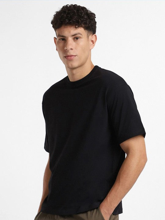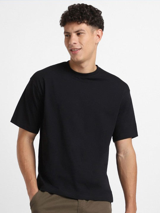 Add a pop of color to your wardrobe with this black, blue, and green men’s graphic T-shirt. Designed in a relaxed, oversized silhouette, it features a bold graphic print on soft knitted cotton. The round neckline and drop-shoulder short sleeves offer a laid-back look perfect for everyday wear.