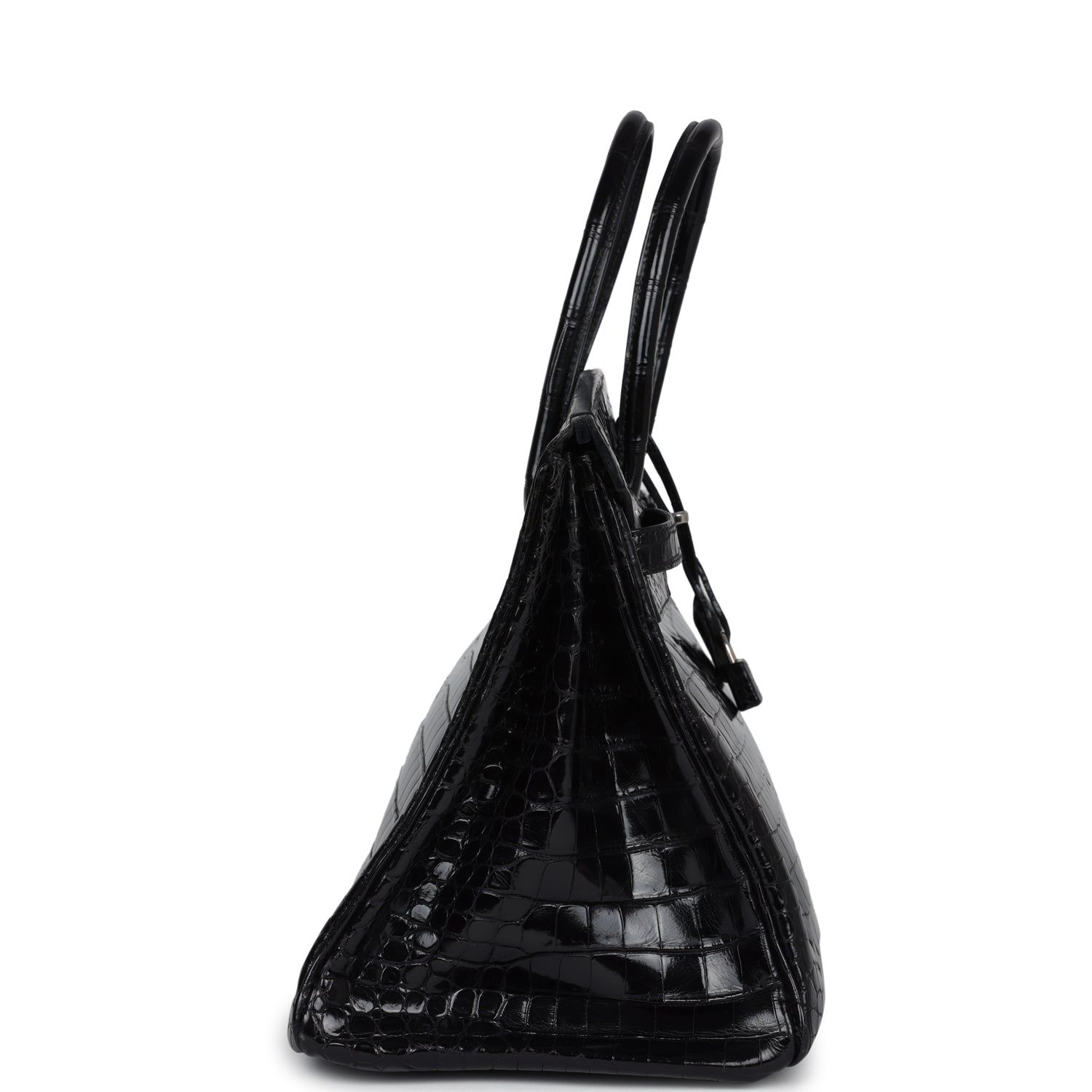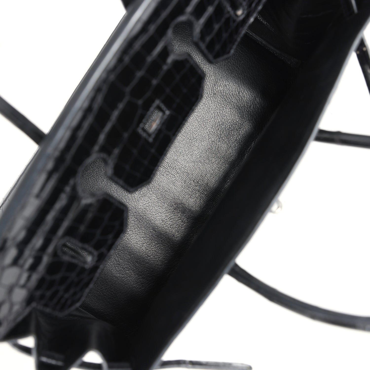 This Birkin is of Black shiny Porosus crocodile with palladium hardware and features tonal stitching, front flap, two straps with center toggle closure, clochette with lock and two keys, and double rolled handles.